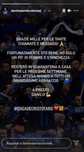 Tramite una storia su Instagram, il difensore dell’Inter, Danilo D’Ambrosio, rassicura sulle sue condizioni di salute dopo essere stato riscontrato positivo al Covid-19.