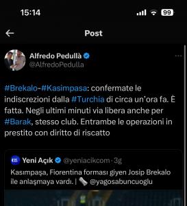 Come vi avevamo anticipato qualche giorno fa, la Fiorentina aveva trovato l’accordo per il trasferimento di Antonin Barak al Kasimpasa. Ora è anche ufficiale. Ecco il comunicato del club: “Il nostro nuovo trasferimento, Antonín Barák, ha firmato il contratto che lo lega a Kasımpaşa durante la cerimonia della firma tenutasi presso i nostri impianti sportivi Turgay Ciner, dopo i controlli che ha effettuato presso il nostro sponsor sanitario Liv Hospital Vadi Istanbul”.