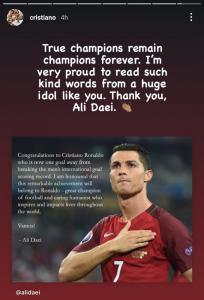 Di risposta, il portoghese, ha condiviso sulle sue stories Instagram le parole di Ali Daei e ha risposto: “Un vero campione rimane un campione per sempre. Sono molto orgoglioso di leggere parole simili da un grande idolo come te. Grazie, Ali Daei”.
