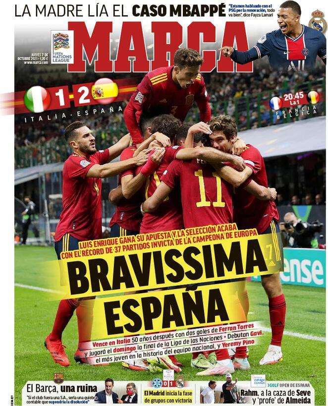 Ieri sera, allo stadio San Siro, la Spagna ha battuto 2-1 l’Italia guadagnandosi la finale di Nations League. L’edizione odierna dei quotidiani iberici esulta per la vittoria ed esalta la squadra allenata da Luis Enrique. Di seguito le prime pagine dei quotidiani.