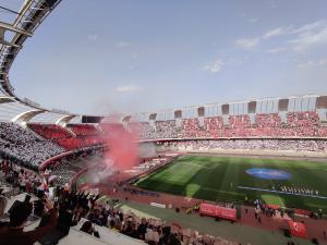Giornata di festa per il Bari, che festeggia quest’oggi la promozione in B. All’inizio della gara contro il Palermo la coreografia della Curva Nord, tra bandiere, fumogeni colorati e cori. Di seguito le foto della festa.