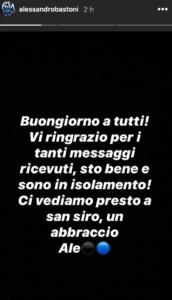 Il difensore dell’Inter, Alessandro Bastoni dopo esser risultato positivo al test del covid–19, attraverso instagram ha salutato i tifosi nerazzurri. Questo il suo breve commento in una stories: “Buongiorno a tutti! Vi ringrazio per i tanti messaggi ricevuti, sto bene e sono in isolamento. Ci vediamo presto a San Siro, un abbraccio”.