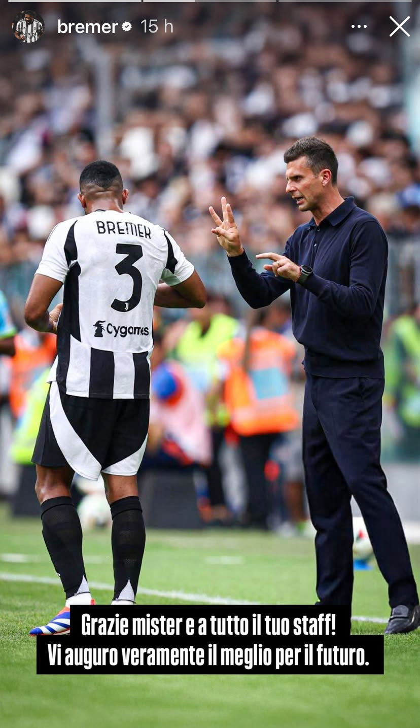Dopo il post di Mbangula dove salutava e ringrazia Motta e tutto il suo staff, a porgere il suo saluto all’ex allenatore bianconero è anche Bremer. Infatti, il difensore della Juventus, ha pubblicato una storia sul suo profilo Instagram che lo ritrae insieme a Motta con una breve descrizione: “Grazie di tutto mister a tutto il tuo staff. Vi auguro il meglio per il futuro”.