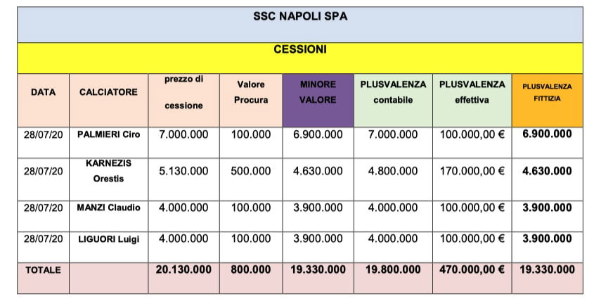 Complessivamente, le cessioni sono valse 20,1 milioni per complessivi 19,8 milioni di plusvalenze, mentre gli acquisti hanno portato un esborso pari a 71,2 milioni. Tuttavia, è l’accusa degli inquirenti, il reale valore dei giocatori ceduti è pari a 470mila euro, con plusvalenze fittizie per 19,3 milioni.