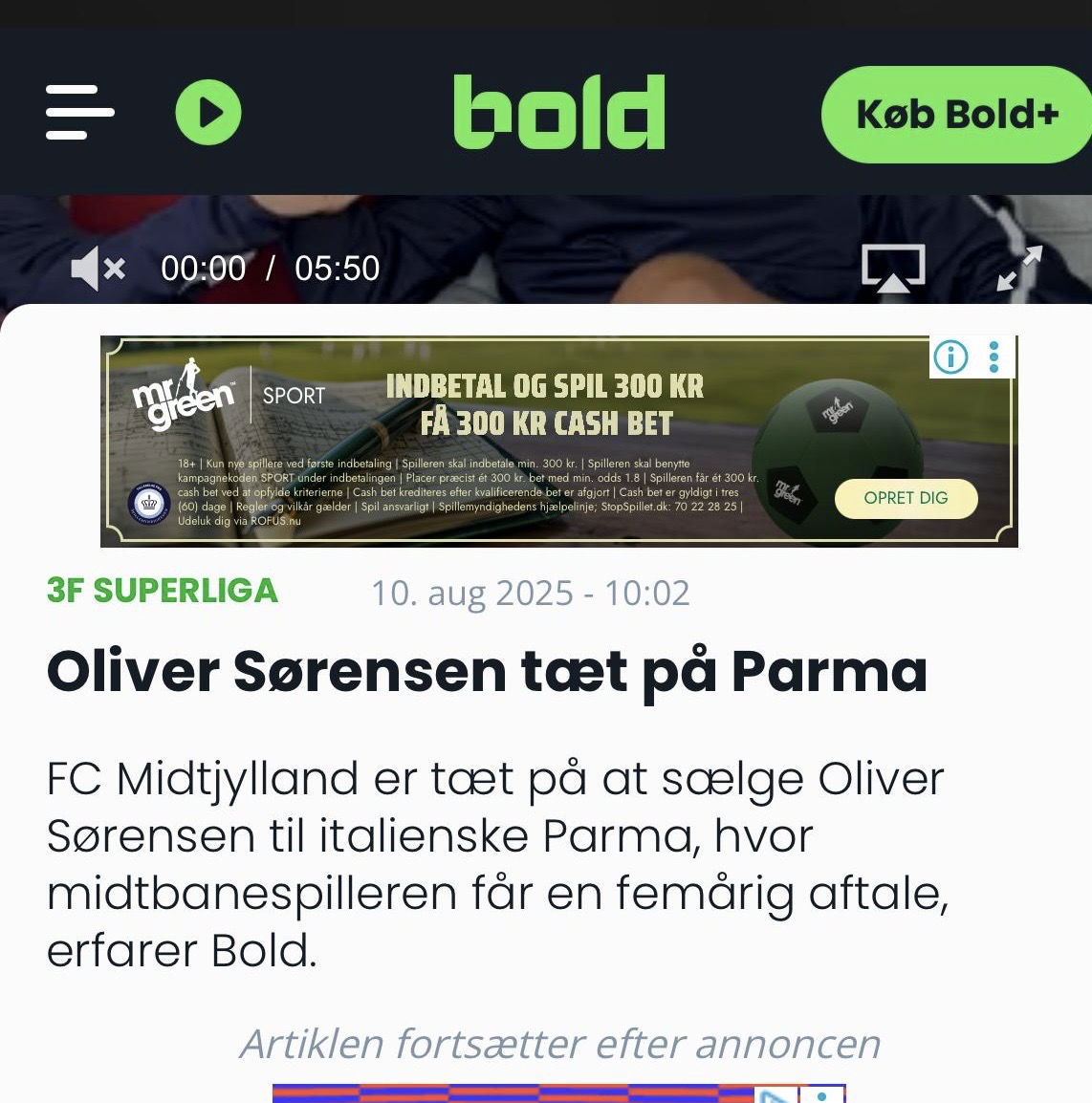 Un nuovo centrocampista per il Parma, si tratta di Oliver Sorensen, classe 2002 del Midtyilland. Stamattina alle 10,02 una fonte danese (Bild) che alleghiamo ha svelato che mancano pochi dettagli per il trasferimento, operazione da circa 10 milioni bonus inclusi. Sorensen non è stato convocato per la gara di oggi contro il Fredencia ed è pronto a firmare un quinquennale con il Parma.