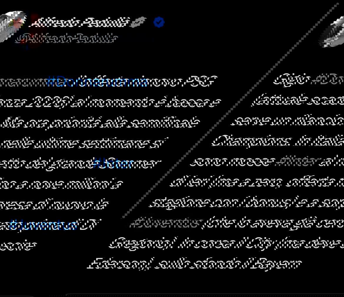Il Galatasaray sta lavorando intensamente per portare Ederson in Turchia, come stiamo raccontando da oltre una settimana. E in contemporanea il Manchester City tiene d’occhio Gigio Donnarumma per una staffetta che va oltre le considerazioni generali, fino a pochi giorni fa l’ex Milan mai era stato accostato al club di Guardiola. Anzi, era ritenuta una pista impossibile, al punto che veniva data la precedenza ad altri club inglesi davvero in corsa. In realtà, Ederson-Donnarumma è una staffetta che vi abbiamo raccontato in assoluta esclusiva oltre 3 mesi, era il 7 maggioquando avevamo evidenziato l’interesse del City per Gigio legato a un’uscita di Ederson. Il Galatasaray è già arrivato – come raccontato – a 10 milioni per il portiere in uscita dal club inglese: ora si tratta di perfezionare l’intesa, poi il Manchester City andrà dal Paris Saint-Germain (i contatti ci sono già stati) per gli accordi definitivi legati all’immediato trasferimento di Donnarumma alla corte di Guardiola. Lavori in corso…