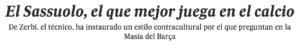 Un modello da seguire, in Italia e in Europa: è questa la storia del Sassuolo anche fuori i confini nazionali. Lo dice anche El Pais, noto quotidiano spagnolo, che ha elogiato il lavoro di Roberto De Zerbi e tutto il club neroverde. “Il Sassuolo, la squadra che gioca meglio nel calcio” si legge sul quotidiano che poi esalta anche il tecnico: “Malato di calcio, ammiratore di Bielsa e Guardiola, che ha liquidato il Napoli 0-2 una settimana fa con la difesa a tre del Barça di Cruyff”. L’allenatore che ha stabilito uno stile contro-culturale che chiedono alla Masia del Barça ha chiosato il quotidiano.