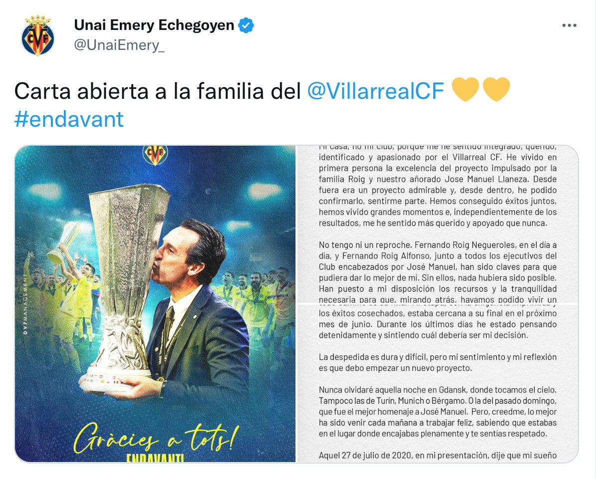 È con una lettera pubblicata sui social che Unai Emery si è congedato dai tifosi del Villarreal sottolineando quanto sia stato felice ma ora ha la necessità di un nuovo progetto all’Aston Villa. Ecco le sue parole: