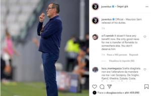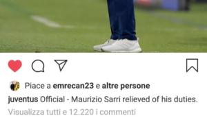 L’esonero di Sarri è la conseguenza dell’eliminazione precoce dalla Champions League, ma anche dei rapporti poco idilliaci con alcuni calciatori. In seguito al comunicato ufficiale dell’addio a Sarri, spuntano alcuni likes di calciatori che militano nella società bianconera o che hanno vissuto negli scorsi mesi lo spogliatoio bianconero. Il primo ad aver messo “mi piace” è stato EmreCan, escluso ad agosto dalla lista Champions e venduto nella scorsa sessione invernale al BorussiaDortmund . Subito dopo, arrivano apprezzamene anche da parte di Mario Mandzukic e di DouglasCosta.
