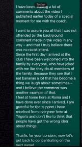 Voglio assicurare a tutti che non sono stato offeso dal commento fatto nel video in nessun modo – e che non aveva alcun fine razzista.