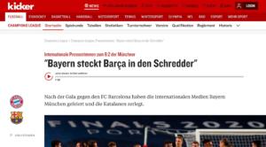 Se da un lato la stampa spagnola attacca il Barcellona, in Germania invece si festeggia sulla falsa riga della rocambolesca vittoria al Mondiale contro il Brasile. Il Bayern Monaco con la vittoria sul Barça si candida alla vittoria finale e aspetta l’altra semifinale tra Manchester City e Lione. Bild e Kicker festeggiano. La rassegna stampa dei quotidiani tedeschi ha un solo grido: “Grandiosi”.