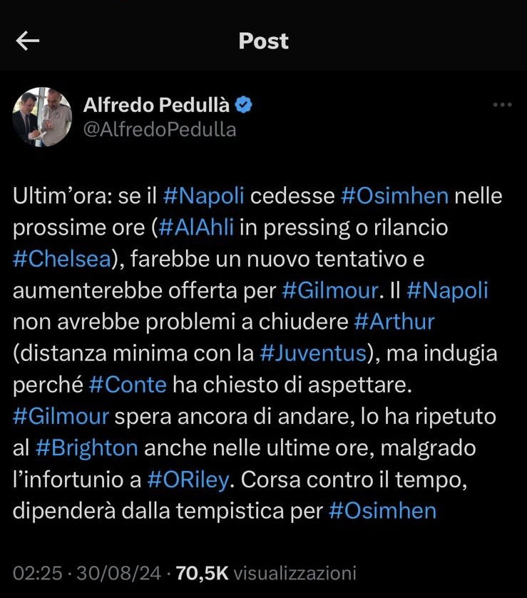 Occhio alle sorprese delle ultime ore. E quella relativa a Billy Gilmour potrebbe essere clamorosa, ve l’abbiamo svelata nella notte con un tweet delle 2,25. Il Napoli sta meditando di tornarci con forza, proprio per questo motivo è stata messa in stand-by la trattativa con la Juventus per Arthur, non sarebbe complicato trovare un accordo. Tutto questo perché il Napoli sta chiudendo la cessione di Osimhen, sempre più vicino all’Al Ahli malgrado il tentativo disperato del Chelsea. Operazione da 75-80 milioni più bonus con ingaggio stratosferico da almeno 35 milioni a stagione (contratto quadriennale). Nell’accordo presente una clausola liberatoria come svelato ieri. E così il Napoli avrebbe la forza economica per tornare su Gilmour che sta spingendo sempre più per lasciare il Brighton malgrado l’infortunio di O’Riley. E confida di essere accontentato, il Napoli spera di andare fino in fondo.