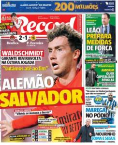L’edizione odierna di Record, quotidiano portoghese, apre con il titolo: “Il tedesco salvatore”. Ovviamente si riferisce a Waldschmidt, capace di regalare i tre punti al Benfica in pieno recupero contro il Pacos de Ferreira.