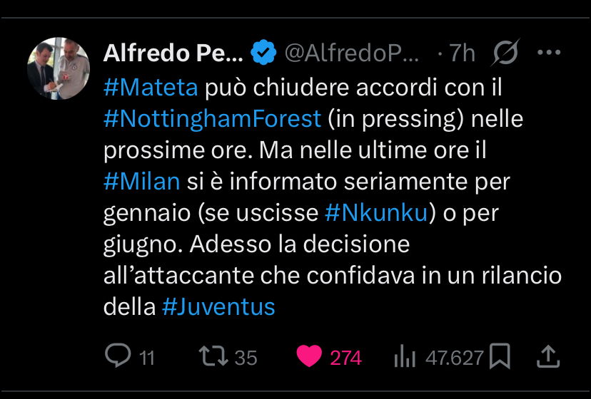 Il futuro di Jean-Philippe Mateta è tutto da scrivere, ma ci potrebbe essere una clamorosa svolta. Il Nottingham Forest potrebbe chiudere da un momento all’altro, ma ancora non l’ha fatto. E il rischio è quello di essere bruciato. Con un tweet dell’1,17 nel buio della notte vi abbiamo svelato il clamoroso inserimento del Milan che ha lavorato sottotraccia nella giornata di ieri dopo gli apprezzamenti degli scorsi mesi. In sostanza il Milan ha detto agli agenti di Mateta (in ottimi rapporti con Moncada) di essere aperto a due soluzioni. La prima: entrare in scena subito, entro la chiusura del mercato di gennaio, se si individuasse la soluzione in uscita per un attaccante, l’indiziato è Nkunku. La seconda: trovare un accordo adesso per prenderlo a giugno chiudendo l’operazione in queste ore, Possibile e clamorosa svolta che la Gazzetta dello Sport ha confermato con un articolo pubblicato sul sito all’1,37, esattamente venti minuti dopo la nostra esclusiva, con il quotidiano andato on line in quei minuti. Ricordiamo che Mateta ha un contratto in scadenza il 30 giugno 2027 e che il Nottingham Forest aveva presentato una proposta di circa 40 milioni di euro. Facciamo un esempio: prenotandolo adesso per giugno, si potrebbe avere un piccolo sconto sul cartellino (magari da 40 milioni a 28-30 più bonus) considerato che Mateta andrebbe in scadenza di contratto. In un mercato pazzo consigliamo di aspettare perché le cose cambiano ogni cinque minuti e il Nottingham magari spera ancora. Ma il clamoroso inserimento del Milan c’è stato e va seguito con grande attenzione, perché la voglia di Italia di Mateta è tanta e il mancato rilancio della Juve gli ha provocato delusione. Ripetiamo: il Nottingham aveva e forse ha ancora qualche carta in mano, ma il Milan sta lavorando per un clamoroso sorpasso.