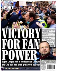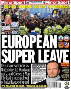 Il calcio inglese è il primo Paese ad aver reagito contro la Super Lega in massa. Le proteste dei tifosi di ieri in occasione delle partite della Premier League hanno incentivato i club interessati a rivedere la posizione sulla Super Lega. La stampa inglese si è schierata apertamente, il Mirror ha aperto elogiando il dietrofront delle sei squadre: “Vittoria per i tifosi, vittoria per il calcio” con il titolo “Super congedo europeo”.