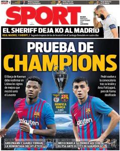 I principali quotidiani sportivi spagnoli, nelle prime pagine odierne, si sono soffermai sulla clamorosa sconfitta del Real Madrid che ieri ha perso in Champions League contro i moldavi dello Sheriff. Questo il tiolo di Marca: “Un colpo alto”. Sulla stessa line d’onda As: “Lo Sheriff impone la sua legge”, poi sulla sfida tra Milan-Atletico Madrid: “Resuscita l’Atletico”. Sport, giornale catalano, si sofferma in prima pagina sul Barcellona che affronterà il Benfica: “Test Champions”.