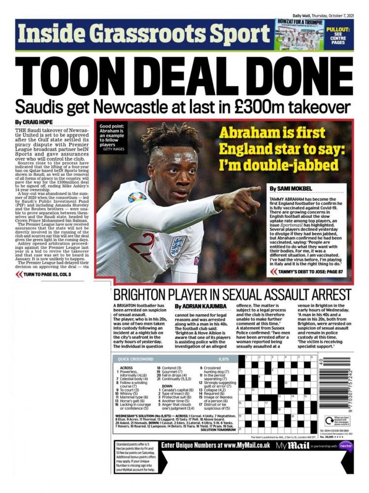 L’apertura del Daily Mail: “I Sauditi acquistano il Newcastle per 300 milioni di sterline”