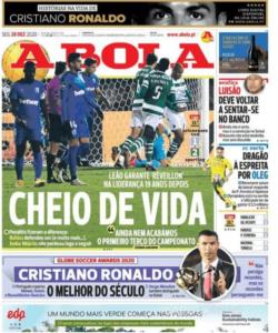 A Bola titola “Pieni di vita”, e si riferisce allo Sporting Lisbona che batte la Belenenses con una rete di Tiago Tomas dopo 5 minuti ed il raddoppio su rigore di Joao Mario alla mezz’ora. Sarà lo Sporting a chiudere l’anno al comando della Primeira Liga a prescindere dal risultato del Benfica di oggi.