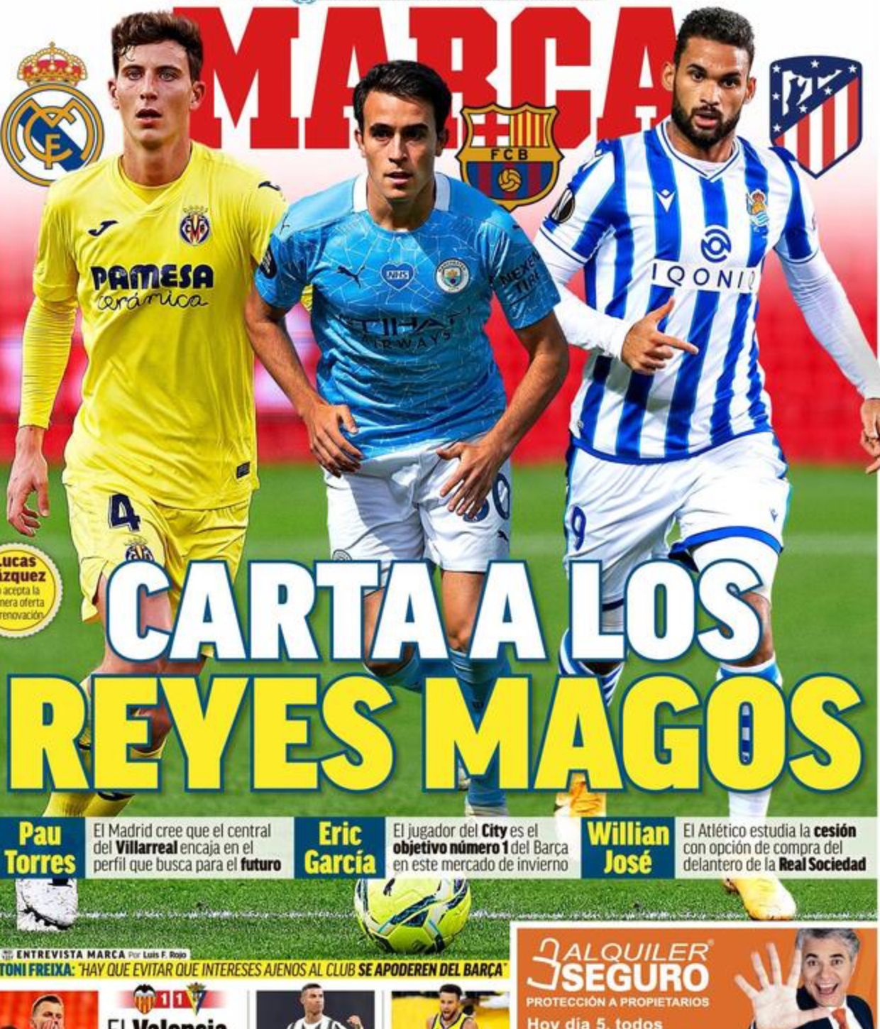 Apre con un titolo che richiama all’Epifania, Marca, facendo il punto del mercato in Spagna. Pau Torres piace molto al Real Madrid, che lo considera il profilo giusto per il futuro della difesa dei Blancos. Eric Garcia è invece l’obiettivo del Barcellona, così come William Jose è nella mire dell’Atletico Madrid, alle prese con il dopo Diego Costa.