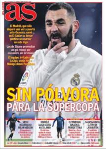 Marca titola “Il viaggio senza fine”, dovuto al Real Madrid che è rimasto bloccato a Pamplona dopo la partita contro l’Osasuna a causa della tempesta di neve che ha colpito la Spagna, e che si recherà direttamente a Malaga, e poi a Siviglia per la Supercoppa.