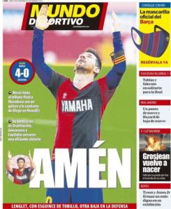 Le prime pagine dei maggiori quotidiani sportivi spagnoli hanno dedicato grande spazio alla dedica di Messi a Diego Armando Maradona durante la gara vinta per 4-0 contro l’Osasuna.