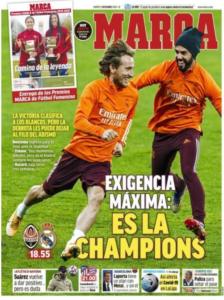 Marca titola “Massima esigenza: è la Champions”, con la prima pagina interamente dedicata al Real Madrid che con una vittoria contro lo Shakhtar si qualificherebbe al turno successivo. Dovesse però perdere sarebbe sull’orlo dell’abisso. Benzema recupera, Hazard out fino al 2021.