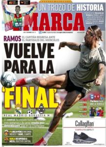 Marca titola “Torna per la finale”. Il capitano del Real Madrid Sergio Ramos torna in tempo per la grande partita di mercoledì.