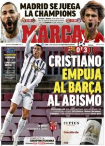 Per Marca “Cristiano spinge il Barça nell’abisso”, apertura dedicata al tonfo interno del Barcellona sconfitto per 3-0 dalla Juventus, che gli costa la qualificazione al secondo posto nel girone. I catalani non perdevano in casa in Champions League dal 2013.