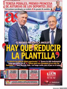 As: “Ancelotti: ‘Dobbiamo ridurre la rosa’. Il Real Madrid presenta il tecnico: “La storia ci chiede un calcio spettacolare. Sergio Ramos è stato fondamentale; devo parlargli. Zidane ha vinto tre Champions League in poco tempo; è stato fantastico. Isco, Marcelo, Bale… ho affetto per loro, ma il giudice è il campo”.