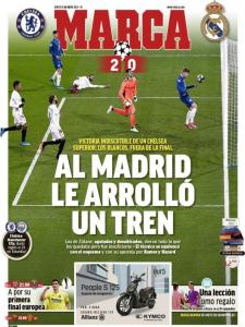 I quotidiani spagnoli aprono questa mattina con titoli forti sull’eliminazione del Real Madrid dalla Champions League. La sconfitta di ieri contro il Chelsea è stata netta e i giornali spagnoli lo hanno rimarcato. “Il Real è stato investito da un treno” è l’apertura di Marca, una vittoria degli inglesi non messa mai in discussione che si è conquistata meritatamente la finale con un secco 2-0. As apre col titolo “Senza forza e senza Champions“, un Chelsea solido come all’andata liquida un Real Madrid senza forza con tante scelte sbagliate – secondo As – come le ali che Hazard e Vinicius che sono stati quasi invisibili.