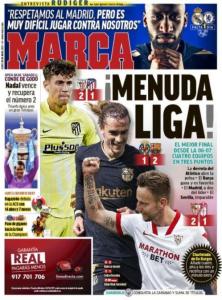 As titola “Quattro squadre in un pugno” con i vari risultati delle partite interessate. E giovedì Koeman recupera la partita di campionato contro il Granada. Anche Sport fa un titolo simile: “La Liga è più vicina“, la doppietta di Griezmann a Villarreal manda a 2 punti il Barca dal titolo, con la vittoria nel recupero i blaugrano sarebbero in testa. Marca elogia questo finale con il titolo “Che Liga!“. La migliore lotta dal 2006/2007 con quattro squadre in tre punti, atenzione al Siviglia inarrestabile.