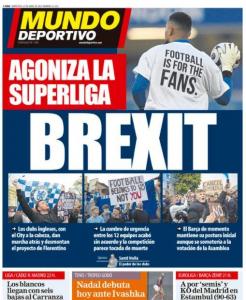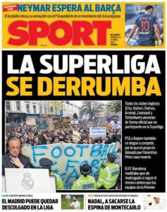 Il Mundo Deportivo esce col titolo “Brexit”, parte il Manchester City, poi seguono tutte le squadre inglesi a lasciare la Super Lega. Sport scrive “La Super Lega crolla” con i club inglesi che hanno fatto da guida, la riunione di ieri sera non ha dato esito positivo e il progetto cade. Anche As parla dell’Inghilterra che “fa saltare in aria la Super Lega”. Florentino Perez e Agnelli si ritrovano soli, in Italia anche Milan e Inter si tirano indietro, mentre il Barcellona farà decidere l’Assemblea.