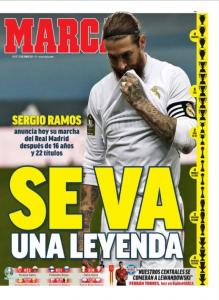 Ecco le prime pagine dei maggiori quotidiani sportivi spagnoli, in edicola questa mattina. L’addio di Sergio Ramos dal Real Madrid tiene indubbiamente banco nelle aperture delle testate iberiche. Aprono allo stesso modo sia As che Marca: “Se va una leyenda (Una leggenda sta partendo)”. Il capitano dei blancos lascia Madrid dopo 16 anni e 22 titoli conquistanti: 671 partite giocate e 101 gol segnati.