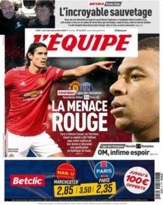 “La minaccia rossa” è il titolo di oggi del prestigioso quotidiano francese L’Equipe. Paris Saint Germain punta ai 3 punti all’Old Trafford contro il Manchester United e contro il suo ex Edinson Cavani, serve vincere per restare padroni del proprio destino nel girone e ottenere la qualificazione agli ottavi di Champions League.