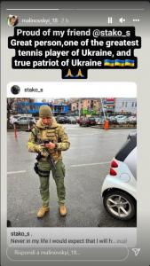Malinovskyi posta una foto dell’ex tennista Stakhovsky, arruolatosi per difendere l’Ucraina: “Orgoglioso di te”