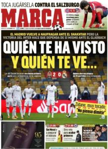Marca titola “Chi ti ha visto e chi ti vede…” dopo la debacle del Real Madrid contro lo Shaktar, ma la vittoria dell’Inter gli dà un’altra chance contro il Gladbach. Buon primo tempo per i blancos che però sono affondati nel secondo. Quinta sconfitta in 15 partite in stagione per la squadra di Zinedine Zidane.