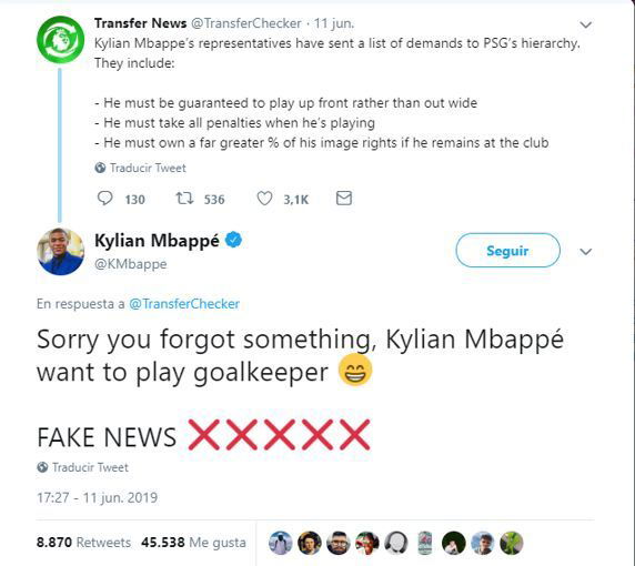 Il nome di Mbappé è uno di quelli che smuove, e non poco, le fantasie mercato di molti club europei. L’attaccante classe ’98 ha un contratto in scadenza nel 2023, ma le voci intorno ad un possibile divorzio dal PSG non mancano. Sul proprio profilo Twitter, ‘Transfer News’ ha parlato di un incontro tra gli agenti di Mbappé e il Club parigino; sul tavolo le richieste del giocatore per poter continuare con la maglia del PSG. Le condizioni dettate sarebbero state le seguenti: “Garantire di giocare al centro dell’attacco e non sulla fascia, calciare tutti i rigori quando è in campo e una maggiore percentuale di diritti di immagine”. L’attaccante francese non è rimasto impassibile a questa notizia e ironicamente ha risposto: “Scusa, hai dimenticato qualcosa. Kylian Mbappé vuole fare il portiere. FAKE NEWS”, ha concluso la stella francese.