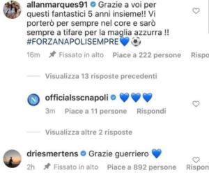 L’attaccante del Napoli, Dries Mertens, ha voluto salutare attraverso i social l’ormai ex compagno di squadra Allan, ufficialmente passato all’Everton di Ancelotti. Rispondendo al messaggio di congedo del brasiliano pubblicato su Instagram, Mertens ha scritto: “Grazie guerriero”.