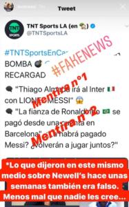 Subito smontate le riflessioni di ieri dell’emittente TNT Sports che avevano semplicemente accostato Leo Messi all’Inter, in modo comunque blando e non troppo convincente. A chiarire qualsiasi dubbio ci ha pensato il fuoriclasse argentino, sul suo profilo Instagram, con un post a dir poco chiaro: “Sono tutte fake news, sia quelle che riguardano l’Inter che le altre sul Newell’s Old Boys. Menomale che nessuno crede a questa emittente”.