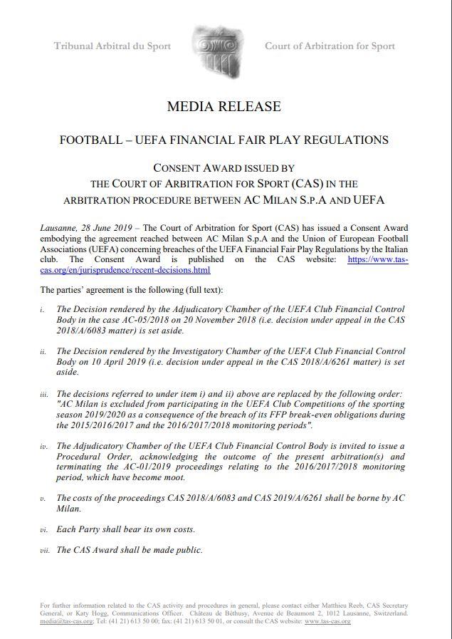 Mediante un comunicato pubblicato sul proprio sito ufficiale, il TAS ha recentemente pubblicato il Consent Award tra il Milan e la Uefa, annunciando ufficialmente che i rossoneri non prenderanno parte alla prossima edizione dell’Europa League.