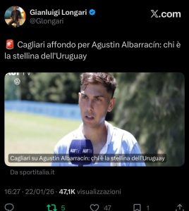 Come raccontato in esclusiva da Gianluigi Longari lo scorso 22 gennaio, Agustin Albarracin è un nuovo giocatore del Cagliari, c’è l’annuncio dei sardi: “Il Cagliari Calcio comunica di aver acquisito il diritto alle prestazioni sportive del calciatore Agustín Albarracín che si trasferisce a titolo definitivo dal Club Atlético Boston River e ha firmato un contratto che lo lega ai colori rossoblù fino al 30 giugno 2030, con opzione di prolungamento per un’ulteriore stagione a favore del Club. Nato a Montevideo il 29 agosto 2005, Albarracín è cresciuto nel settore giovanile del Montevideo Wanderers, con cui ha firmato il primo contratto professionistico nell’aprile 2023. Ha debuttato in prima squadra il 24 giugno seguente nell’incontro di Primera División pareggiato 0-0 contro il Peñarol; il 23 luglio ha segnato il suo primo gol in prima squadra (44 presenze e 2 gol in totale) decidendo la trasferta contro il Boston River, squadra che lo acquisterà nel 2025 e dalla quale ora si trasferisce in Sardegna. Con il Boston River ha all’attivo 33 presenze e 11 gol. Il 26 febbraio 2025 ha debuttato in Coppa Libertadores nell’1-1 contro la Ñublense, mentre in Coppa Sudamericana sono 4 le presenze con 2 gol all’attivo. Albarracín è un attaccante moderno e dinamico, capace di muoversi su tutto il fronte offensivo. Predilige partire da posizione centrale, accanto a un partner d’attacco, ma sa adattarsi con efficacia anche sull’esterno, mettendo in mostra rapidità, qualità tecnica e spiccato senso del gol. Giocatore di talento e personalità, abbina ottime doti di finalizzazione a una naturale capacità di partecipare alla manovra. Le sue prestazioni lo hanno rapidamente portato a essere considerato uno dei prospetti più interessanti del calcio uruguaiano, fino alla convocazione e al ruolo da protagonista con la Nazionale Under 20: 12 presenze (6 al Campionato Sudamericano) e 1 gol per lui con la “Celeste” Sub-20, dove ha legato in modo particolare con un altro prospetto uruguaiano nella rosa rossoblù qual è Juan Martín Rodríguez. Con l’arrivo di Agustín Albarracín, prosegue la lunga e prestigiosa tradizione che lega l’Uruguay al Cagliari: un rapporto che dura da oltre 40 anni e che ha visto numerosi grandi nomi sbarcare in Sardegna, diventando protagonisti in campo e simboli eterni della storia rossoblù. Benvenuto a Cagliari, Agustín!”