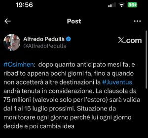Victor Osimhen ha parlato in conferenza stampa presentando la partita contro la Juventus: “Sappiamo che è uno dei club più importanti, hanno qualità. Non vogliamo arrivare con superiorità e sottovalutarli. Sarà una notte molto lunga. Abbiamo tanti giocatori di esperienza in grado di affrontare tante circostanze. Siamo pronti ad affrontare questa partita, vogliamo giocare, impegnarci come all’andata. Non sarà facile per loro vista l’andata ma vogliamo combattere e abbiamo un desiderio forte di vincere. Non riesco a segnare effettivamente ma faccio comunque assist, cerco di dare il mio contributo. Non importa se non riesco a fare gol ma è importante aiutare la squadra. Non riguarda solo Osimhen ma più in generale il Galatasaray. La Juventus è uno dei club più importanti, sono ricchi di storia e hanno un sacco di leggende che han giocato per questo club. Quando mi hanno parlato all’epoca ero desideroso di venire prima che si presentasse il Galatasaray, c’erano un po’ di ostacoli. Questo trasferimento poi non si è realizzato ma se ci saranno opportunità in futuro ci sono diversi club in cui mi piacerebbe giocare. Giocare qui sarebbe un privilegio, per un giocatore è l’ideale. Ma sono felice nel club in cui sono, amo moltissimo il Galatasaray. Per il futuro non so cosa potrà accadere. Il 90% dei calciatori al mondo vorrebbe giocare nella Juventus”. Vi avevamo raccontato da marzo in esclusiva che Osimhen, nella scorsa primavera, era il principale obiettivo per l’attacco della Juventus: contatti finti e disponibilità del diretto interessato. Poi il ribaltone interno della Juve ha comportato obiettivi diversi e difficoltà nell’arrivare all’attaccante nigeriano, al punto che la Juve non è riuscita ad avanzare nella trattativa, una situazione che ha favorito l’inserimento del Galatasaray.