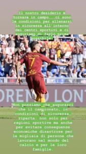 Lorenzo Pellegrini si schiera in favore della ripresa del campionato. Infatti, il calciatore della Roma, tramite una Stories sul suo proprio profilo Instagram, ha manifestato il suo pensiero “Il nostro desiderio è tornare in campo. – si legge – Ci sono le condizioni per allenarsi in sicurezza nei centri sportivi e ci auguriamo di farlo il più presto possibile. Non possiamo che augurarci che il campionato, in condizioni di sicurezza, riparta. Non solo per ragioni sportive ma anche per evitare conseguenze economiche disastrose per le migliaia di persone che lavorano nel mondo del calcio e per le loro famiglie.”