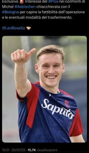 Si parla molto di Simeone e Zerbin in chiave Pisa, ma abbiamo spiegato due giorni fa quanto sia complicato -almeno in queste ore – sbloccare la situazione. Nel frattempo il club neo-promosso sta valutando i rinforzi per altri ruoli e ha chiesto informazioni per Michel Aebischer, non intoccabile a Bologna, una pista che può diventare concreta nei prossimi giorni. La notizia è stata data in esclusiva alla 15,31 da Lorenzo Canicchio di Gazzetta Regionale e scopiazzata da chi è – come sempre – ha l’abitudine di farlo dal mare o dalla montagna senza citare le fonti.