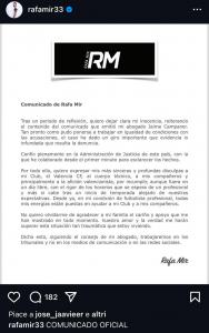 Rafa Mir, accusato di violenza sessuale, ha deciso di parlare apertamente con un post pubblicato sul suo profilo Instagram. Ecco il messaggio del giocatore del Valencia: “Dopo un periodo di riflessione, voglio chiarire la mia innocenza, ribadendo il contenuto della dichiarazione rilasciata dal mio avvocato Jaime Campaner. Non appena ha potuto mettersi a lavoro ad armi pari con le accuse, il caso ha preso una svolta importante che dimostra quanto sia infondata la denuncia. Ho piena fiducia nella Giustizia di questo Paese, con la quale ho collaborato dal primo minuto per chiarire i fatti. Per tutto questo, voglio esprimere le mie più sincere e profonde scuse al mio Club , il Valencia FC, allo staff tecnico, ai miei compagni di squadra e soprattutto ai tifosi valenciani per non aver rispettato, anche se era il mio giorno libero, il rigore dei programmi che ci si aspetta da un professionista, e lo è ancora di più dopo un inizio di stagione lontano dalle nostre aspettative. Da adesso in poi, come calciatore professionista, tutte le mie energie saranno concentrate nell’aiutare il mio Club e i miei compagni. Non voglio dimenticare di ringraziare la mia famiglia per l’amore e il sostegno che mi ha dimostrato in ogni momento. Il suo amore e la verità mi faranno superare questa situazione traumatica che sto vivendo. Detto questo, seguendo il consiglio del mio avvocato, lavoreremo nei tribunali e non nei media o nei social network”.