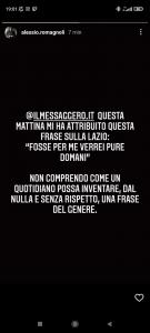 Con un post sui propri Social Alessio Romagnoli ha voluto smentire la frase: “Fosse per me vorrei pure domani” a lui attribuita da Il Messaggero in riferimento alla Lazio. Grande amarezza per il difensore del Milan, che si è detto incredulo per il virgolettato a suo dire inventato dal nulla. Di seguito lo screen del suo post.