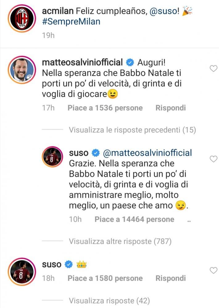 Scambio di battute sui social tra Suso e Matteo Salvini. Nel giorno del compleanno dell’esterno spagnolo il Milan, su Instagram l’ex Ministro dell’Interno ha fatto gli auguri al giocatore rossonero con una critica non troppo velata: “Auguri! Nella speranza che Babbo Natale ti porti un po’ di velocità, di grinta e di voglia di giocare”. Immediata la replica di Suso: “Grazie. Nella speranza che Babbo Natale ti porti un po’ di velocità, di grinta e di voglia di amministrare meglio, molto meglio, un Paese che amo”.