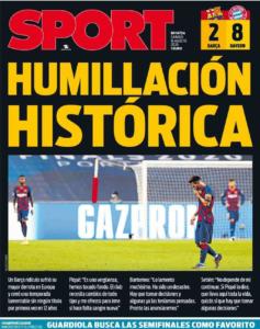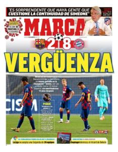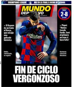Non si placano le parole contro il Barcellona che ieri sera ha perso clamorosamente 8-2 in Champions League contro il Bayern Monaco. La stampa spagnola ci va giù pesante contro Messi e compagni con Quique Setién a rischio esonero. Nel post-partita lo stesso Piqué ha dichiarato che “oggi abbiamo toccato il fondo”.