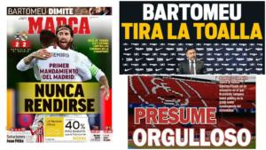 Titoli su Barcellona e Real Madrid, così i quotidiani spagnoli in apertura mentre si dividono la rimonta del Real Madrid che riacciuffa il 2-2 solo nel finale contro il Borussia e le dimissioni di Bartomeu dalla presidenza del Barça. Mundo Deportivo, quotidiano vicino alle vicende catalane, apre con “Dimesso” con il club rimarrà nelle mani del consiglio di amministrazione e che convocherà le elezioni entro un massimo di 3 mesi. I invece attacca l’orami l’ex patron blaugrana con “Bartomeu ha gettato la spugna”. Marca invece dedica la prima pagina alla gara del Real Madrid: “non mollare mai” visto il pari di Casemiro in extremis.