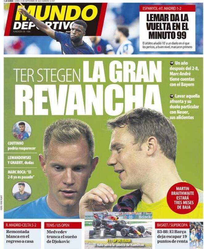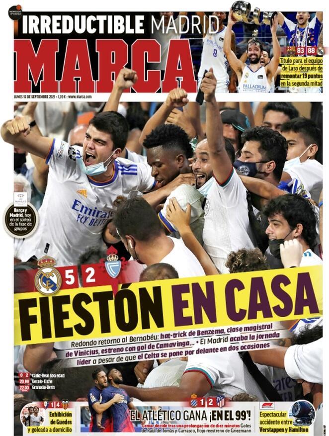 Le aperture odierne di Marca e As dedicano ampio spazio al successo pirotecnico del Real Madrid sul Celta Vigo. 5-2 il risultato finale di un match che ha visto grandi protagonisti Benzema (tripletta) e Camavinga. Sport e Mundo Deportivo, invece, si soffermando sull’attesa sfida di Champions League di domani tra Barcellona e Bayern Monaco. Ecco le prime pagine di oggi.